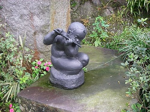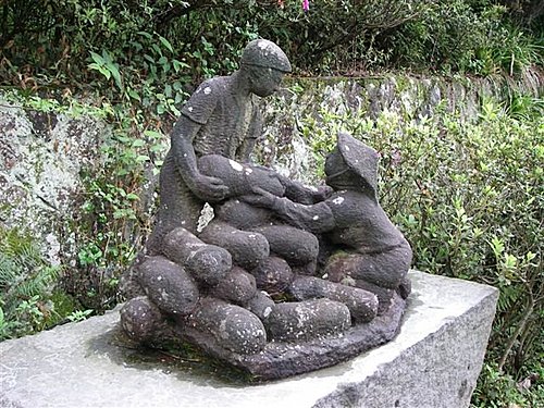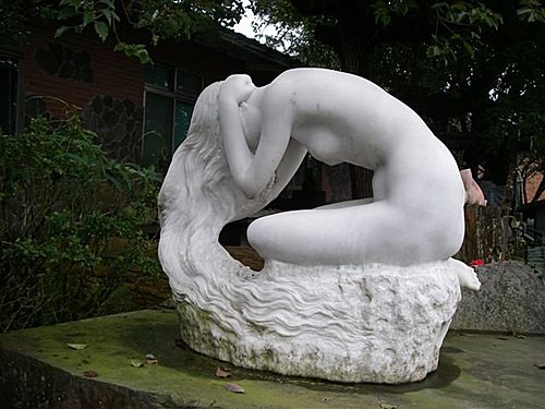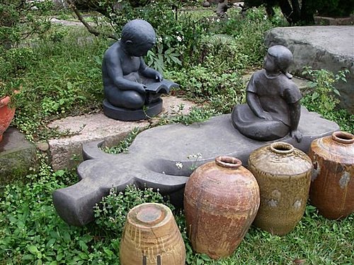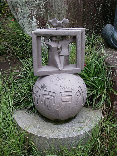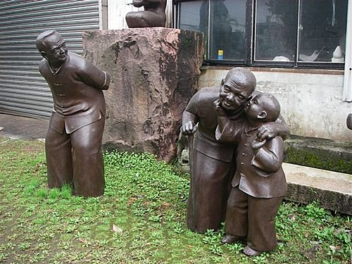 當記者慕名前往新安里的山谷中訪問時,未見王秀杞其人,卻已先看到他的作品,大大小小少說也有幾十座以人物為主角的石雕,陳列在近千坪碧綠的草地上,屋前屋後,大樹下,石級邊,小道旁,台階上,初看似有些零散,不夠規則,細看卻錯落有致,渾然天成。儼然一座露天藝術館。