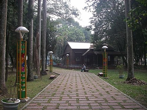 臺灣總督府農林專門學校”就是中興大學的前身,也是實驗林場,是一處擁有許多珍奇樹種的實驗林場。不過此處的實驗林場很小,宛如一座小公園,與一般那種佔地廣大的實驗林場完全不同。此實驗林場,是日治時期,供臺灣總督府農林專門學校學生實習教學之用。實驗林場中央處,有座日治時期的木造建築,可能是當時的教室。走近此建築時,還能聞到散發濃濃的檜木味。古建築經重建後,整建的很有日式風格,古色古香。