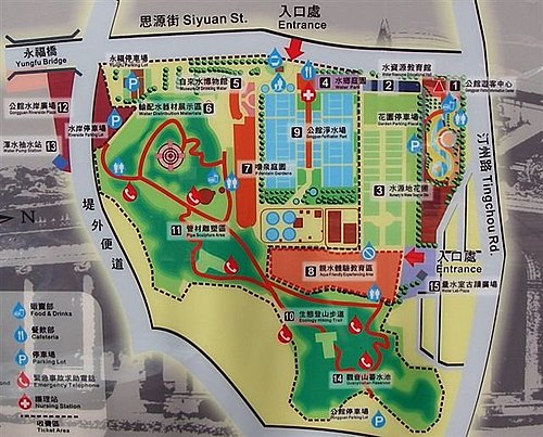 2水資源教育館→4水鄉庭園→8親水體驗教育區→5自來水博物館→7噴泉庭園→小觀音山步道(10、11、14、15)→5自來水博物館