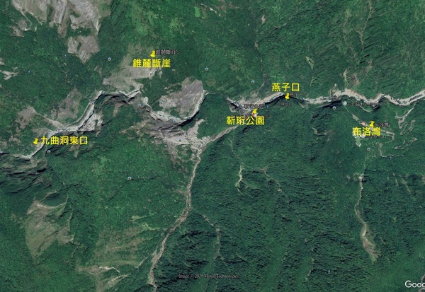 布洛灣往燕子口步道:全長約400公尺,高低落差有160公尺,位在下台地溫室後方,全程舖石階,且有林木遮掩,連接到中橫公路溪畔隧道口,向西約2、300公尺處就是燕子口 。