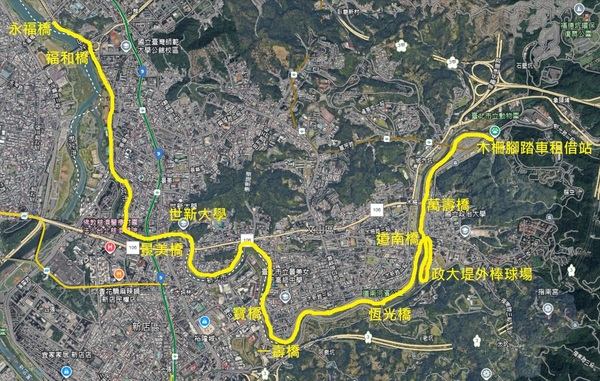 木柵腳踏車租借站(木柵動物園門前)→萬壽橋→道南橋