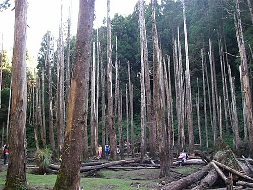 「忘憂森林 」是921大地震後形成的淤積沼澤,杉木林長期泡水而枯死,形成特異景觀,腹地不大,約1.5個足球場的面積(長型),當地的地名叫草坔仔,「坔」就有沼澤或泥漿地之意,國語唸ㄉㄧ\,台語唸LAM或LOM,就是腳踩會陷下去的意思;當地的山友俗稱為枯木林。