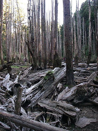 溪阿縱走曾經是早年熱門的縱走路線,它於921地震中路線支離破碎,在這幾年的時間裡,台灣山岳界人士試圖將它重新探勘,並接上。在探勘過程中,發現了一個約4.2公頃的堰塞湖,並將原本生長於此處的柳衫林浸於水中,形成了水中森林的樣貌,因得"水漾森林 "的名稱。然而,如此美麗的名稱卻代表著死亡的哀淒。因為浸泡在水裡的樹根,在經年累月的泡蝕之下會逐漸腐爛,吸收不了營養樹木會逐步凋零。要前往水漾森林 一探究竟,得花上兩天行程翻山越嶺。在水漾森林的數山之隔的"忘憂森林 ",也是因為地震之故而造成的景觀。規模沒水漾森林來得壯大,但只需要從公路邊徒步半小時即可抵達,易達性就比水漾森林 親切多了。