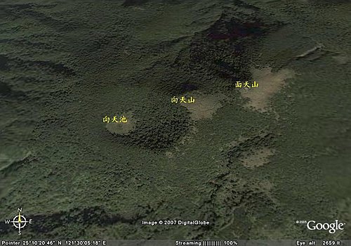 向天山和面天山都是大屯山系最西邊的山頭,兩山隔岸對峙,大約在四十萬年前形成山形,峰頭渾圓,遠看像兩個和尚頭,是典型的鐘狀火山。向天池位於向天山西側,呈漏斗狀的火山口遺跡,直徑三百七十公尺,深一百三十公尺,底部平坦,是陽明山地區最大最完整的火山口。池水的來源主要是來自雨水,當雨季降雨多時池面會隨之擴大,但若長期未有雨水注入則會縮小甚至乾涸!