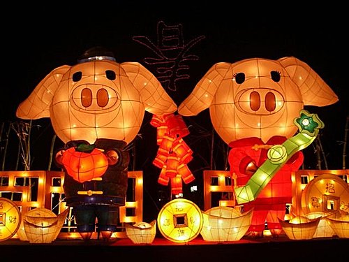 朱古力主燈區位於中正紀念堂瞻仰大道旗桿前。主燈以「圓」為主要造型,呼應今年「福臨台北諸世興」的主題,同時營造傳統節慶交融的氛圍,並串聯臺北市健康友善的意念;透過親切、友善、健康的豬寶寶造型,傳達臺北城健康友善的國際形象,並藉由駐立在半球體上的姿態,象徵臺北城在國際舞台上所扮演的重要角色!