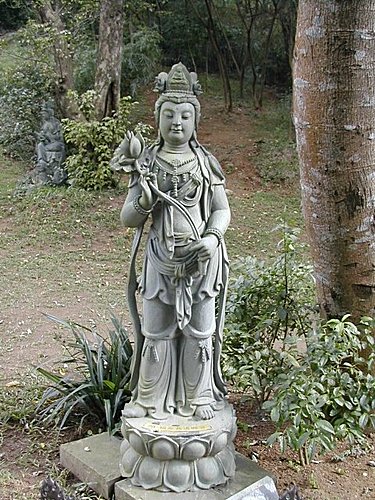 緣道觀音廟的戶外為禪風庭園設計,在占地約一萬坪的園區中,羅列著33尊法相莊嚴、形象各異、全球特有的「三十三觀音」,彰顯觀世音菩薩護念眾生的大悲心與加持力。