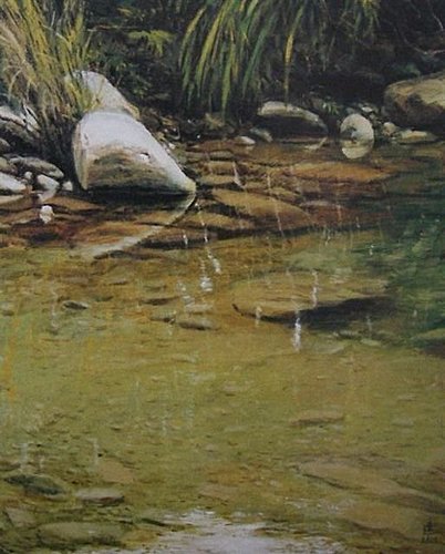 從小在坪林金瓜寮溪畔長大的畫家謝宏達,以3到4年時間,在金瓜寮溪捕捉不同季節、溫度、光線底下千變萬化的水文之美,目前在國父紀念館發表「靜.水.禪.心」個展。 謝宏達生性愛水,兒時最常與同伴到金瓜寮溪玩水,「看到水就有說不出的感動!」他筆下的金瓜寮溪,水質晶瑩剔透、凝靜而流露禪意。他得意的說,這是寫實的,而非畫家的美化,此地居民近年來發動「護魚運動」,金瓜寮溪的水質因而淨化得格外清澈,他認為「愛台灣就是要這樣愛法!」 曾跟著前輩畫家李石樵學藝的謝宏達,因性好淡泊、不喜熱鬧,最喜歡畫風景畫,常透過攝影拍下風情萬種的水文之美,再透過淡油彩形構兼具照相寫實特質,與水彩畫般的清透意境,希望透過水,讓人們體會出「禪即生活」。 謝宏達個展即日起在國父紀念館三樓德明藝廊展至8月20日。