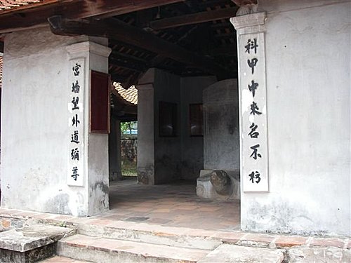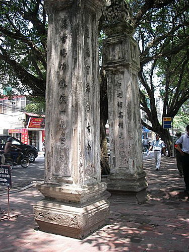 文廟門正門兩側前立有下馬碑石亭。過文廟門進入第一庭院,院內有一大方型蓮池。過大忠門進入第二庭院,再過奎文閣進入第三庭院。院內有一大方型天光井。兩側各一座進士坊,因為越南歷來沒有狀元,所以只為進士刻立石碑,坊內立有82塊進士石碑,每坊各41塊,形成碑林,記載了從大寶三年(1442年)至景興四十年(1779年)337年間的82屆科舉考中的1306名進士的姓名與籍貫。過大成門進入大成殿前的第四庭院。