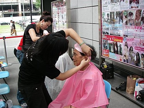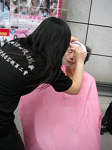 所謂的挽面,是用浸濕的紗線絞去臉上的汗毛,這是一種古老的美容術。操作時,各坐一只凳子,一高一矮,動手者坐高一點,兩人相對。先用手巾給臉上撲上粉,然後用一條長紗線,將其對折,一頭用牙咬緊,另一頭拿在手上,交叉絞動,上上下下、前前後後,把汗毛點點絞乾淨。