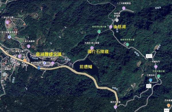 慈湖位於桃園大溪鎮,原名「新埤」,俗稱「埤尾」,佔地廣達約30公頃,因蔣介石生前經常駐臨大溪鎮,湖光山色近似浙江奉化山水,蜿蜒的山間公路上又可遠眺大漢溪,覺得此景觀像極了他的故鄉奉化溪,所以將此地更改名為「慈湖」。