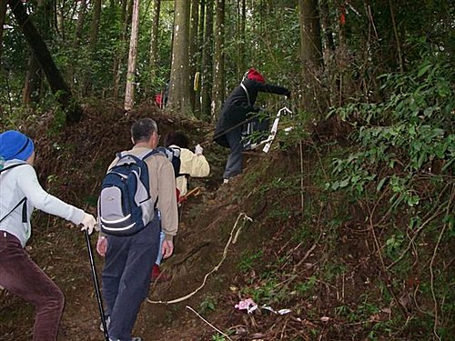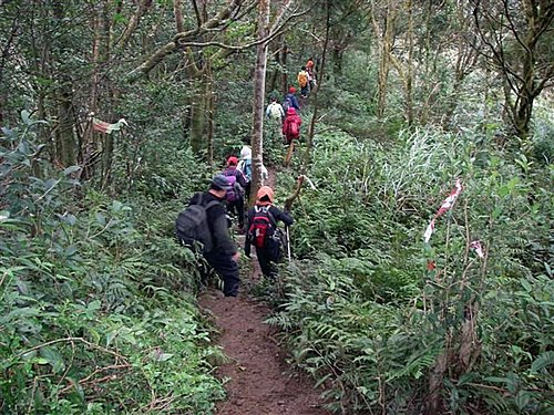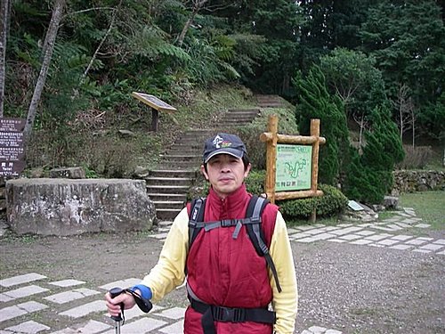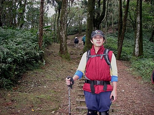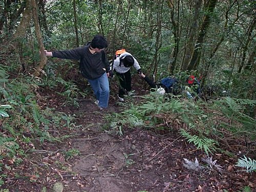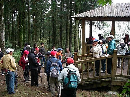 下志繼山續循稜前進,遇丁字叉路(H1055m),左右為東眼山森林遊樂區自導式步道左線,右步道經涼亭可至遊客中心(757M,20分),左步道可往東眼山三角點(985M,40分),大伙於此休息。