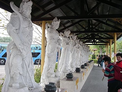 大殿兩側十八羅漢(高9尺),大殿前門神(含座10尺)、四大天王(含座18尺)、彌勒佛(高9.3尺)、韋馱菩薩(高11.2尺)皆以千年老樟木雕刻。另大殿中間走道兩旁,四十八願接引佛則是數百年以上越南檜木雕刻。以上大殿之佛像雕刻,堪稱國寶級工藝品,佛像碩大、雄偉壯觀。