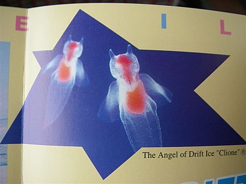 冰海精靈~天使(學名CLIONE PAPI LIONACEA PALLAC)為浮游軟體動物,軟體動物門,腹足綱,翼足目,裸體亞目,海若螺科,屬於雌雄同體。外部形態為頭部發達,位於身體的前端,具有1或2對觸角,觸角為天使的感覺器官,觸角的表面大多具有纖毛,並有簽縮肌,使觸角收縮,這一觸角受來自腦神經節的神經支配,有些裸體類,後觸角的末端被認為是小的或退化的眼睛,其外表皮形成類似角膜的蓋子。