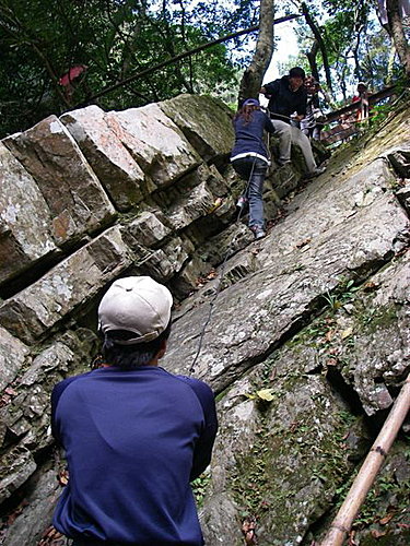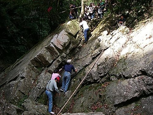 山友們依序攀繩而下
