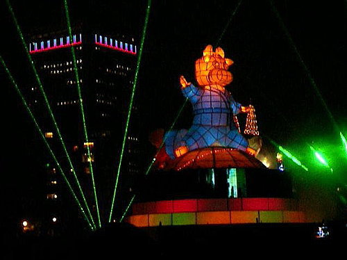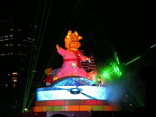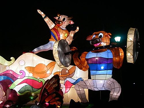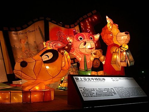 主燈哞哞牛瞬間在眾人眼前緩緩轉動,哞哞牛的身後是大稻埕的唐山帆船,腳邊有三位騎單車的聽奧蛙兒,主燈底座與主體千變萬化,再配上數十道交叉一起的綠色光芒,和乾冰營造的浪漫氣氛,讓人眼睛為之一亮。6日晚,天公不作美,台北的天空不時飄下霏霏細雨,現場擠滿觀眾冒雨賞燈,甚至出現有人為了爭睹哞哞牛可愛模樣,不得不大喊叫前面人「傘收起來,沒雨了!」哞哞牛遊水岸花園台北城」的聲光效果動人,在附近上班的蔣小姐下班後和男友一起來觀賞,第一次參加台北燈會,她說「很棒!」;另外一位,許小姐和從廈門回來的家人一起參加,這位家人表示廈門沒有這麼好看的燈會,而許小姐則是把滿足寫在臉上笑瞇瞇的說,「哞哞牛」搭配聽奧很具國際性。