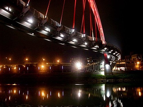 彩虹橋定位為景觀橋,橋面燈飾設計可塑造出彩虹意象,紅色的主拱鋼樑在夜間特別顯眼,另有崁燈照射,河面上可見橋型倒影,側看似條龍,這也是彩虹橋會雀屏中選的原因。