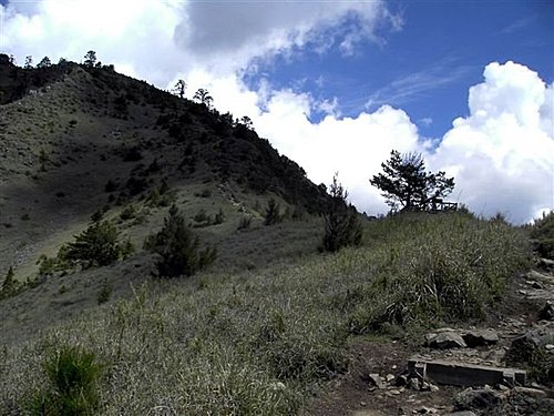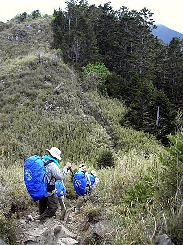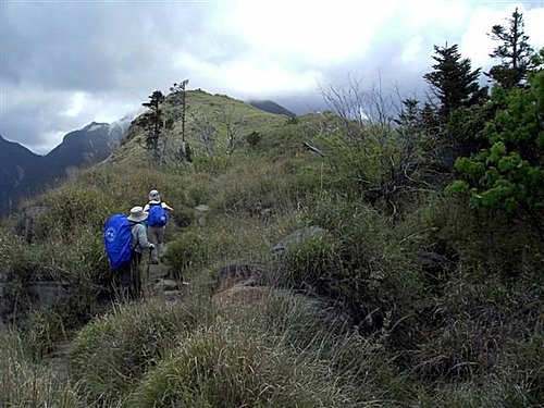 七卡山莊前有一很大的廣場,惟前有高大的林木阻擋,視野並不寬廣。其後的山徑,仍有高大的松樹遮蔭,但行來可就有些累了,它是之字形的陡坡,惟走累了,可坐下來和南湖中央尖對望,又何嘗不是另一種享受呢!當小之字形步道行畢,見到了一片淺草坡,也眺望到桃山時,這是告訴您,只需再努力爬上這淺草坡的之字形步道後,眼前出現的一條直線陡坡,那就是登山客常說的「哭坡」,然而可沒有那麼可怕,事實上,反而是漸入佳境,因為過了哭坡,路就沒有陡坡了(這是指到三六九山莊)。