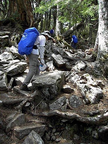 哭坡共約500公尺之長,平均坡度約在50度上下。其辛苦的確要比之字坡有過之而無不及,之字坡雖陡,因為是之字形路線,坡度當然相對緩了許多。哭坡則是一路直上,沒有妥協。所以被山友稱為"哭坡"。如果是在重裝烈日之下到此,真是欲哭無淚、告饒無門。