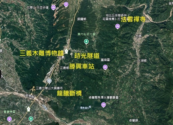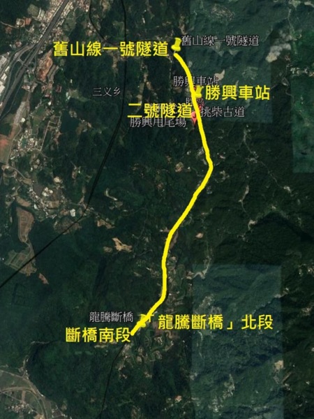 舊山線一號隧道(時光隧道)→勝興車站→二號隧道→「龍騰斷橋」北段→「龍騰斷橋」南段→龍騰新橋(魚藤坪鐵橋)→三義木雕博物館→法雲寺