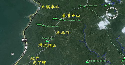 →埡口→灣坑頭山→桃源谷→蕃薯寮山→大溪海邊