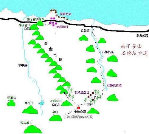 東北角於南雅、龍洞等濱海地區通往草山、燦光寮等山區,有龍洞坑、石梯坑、蚊子坑等古道暨南子吝、南雅山、和美山、龍洞岬等步道。起登點不同,但山徑可相貫通,可組合成上山與下山分別不同的登山路線。