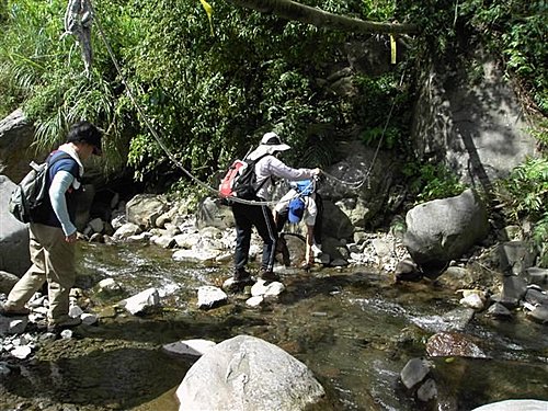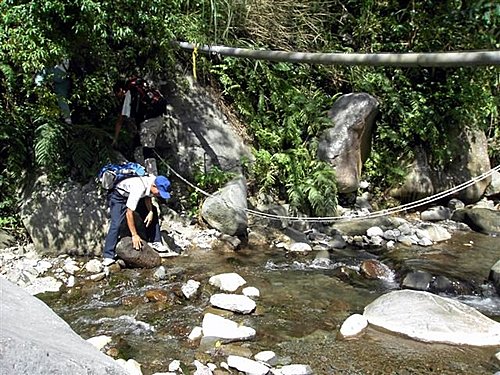 登山口進入後立即需通過清水溪,右側5公尺處有一高架水管自上方橫越,該處可踏石而過。
