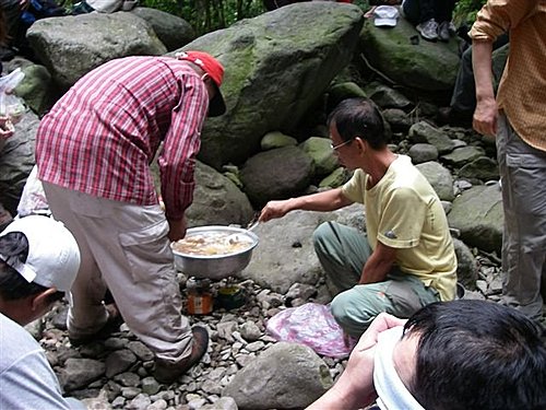 辛苦的會長在阿里磅瀑布下為山友架鍋煮麵