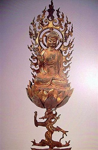 鎏金銅盤龍佛像由背光、蓮花座、盤龍柱、須彌座、方座等五部分組成,佛像的靜謐、巨龍的張揚和諧地融合在一起,纖細扭曲的盤龍撐起沈甸甸的銅佛,都為佛教藝術寶庫增添濃彩重墨的一筆。