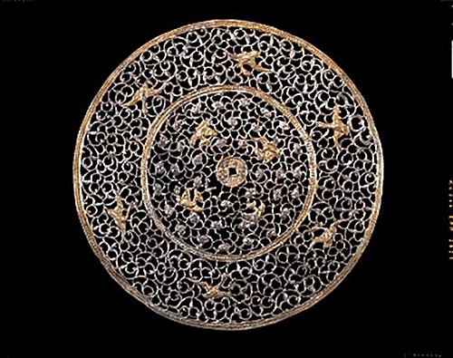 「千秋萬歲」銘鎏金銀墊是另一個以「千秋萬歲」為主題的是「千秋萬歲」銘鎏金銀墊,金銀交輝的銀墊,是一個直徑廿五.四公分的圓形鏤空薄片狀,正中鏤刻一枚圓形方孔銀錢,上刻「千秋萬歲」四個楷字;以聯珠圈分成內外兩圈,外圈裝飾六隻展翅飛翔的鴻雁,周邊鋪陳枝蔓纏繞的忍冬,內圈則以兩對鴛鴦最引人注目,四周鏤刻的是池蓮。銀墊的圖案布局井然有序、層次分明,顯現出一派鳥語花香、祥和溫馨的氛圍。
