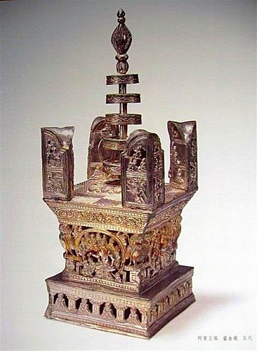 浙江省杭州市雷峰塔建於西元九七二年,二○○一年三月,考古人員將一塊重達一千五百多斤的石板抬起,才讓塵封千餘年的雷峰塔地宮重見天日。而當初興建雷峰塔,據傳是吳越國王為了保存釋迦牟尼佛的髮髻「佛螺髻髮」。而裝著「佛螺髻髮」的就是阿育王塔。