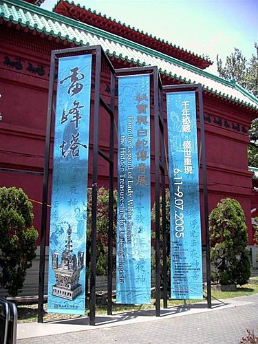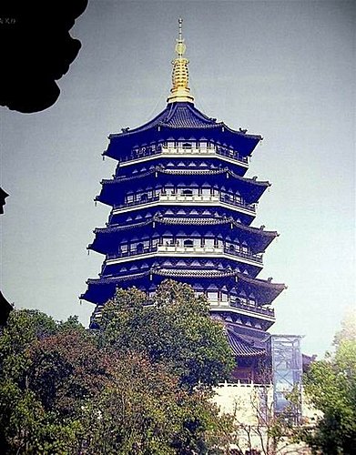 雷峰塔位於杭州西湖山水的制高點上,原塔建於北宋開寶五年(西元972),因為年久失修舊塔在1924年9月25日轟然倒塌,杭州市政府在原址基礎上建造新塔,直到2002年10月25日新塔才落成。塔高71.679米,八面五層樓閣式塔,全塔都是鋼結構,中間有四座電梯,塔外還有電動扶梯,登塔完全不費力,但是門票很貴50人民幣,一般團體都是遠眺,沒有入內參觀。塔頂可以完全觀看西湖風景區,晚上還有燈光投射,所有西湖畔都可以看到,相當漂亮,是許仙與白娘子演譯的千年愛情經典之處。