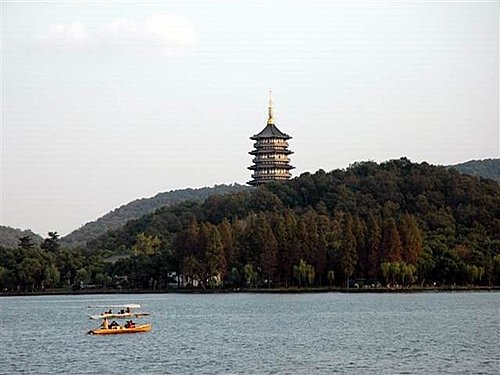 雷峰塔在西湖南岸,南屏山支脈的夕照山上,舊時有一座八面五層的磚塔,是公元975年吳越王錢弘叔爲慶賀妃子黃氏得子而建,俗稱黃妃塔。後人因塔在名為雷峰的小山上,而改稱雷峰塔,夕陽西照時,塔影橫空,金碧輝煌,「雷峰夕照」因而得名。