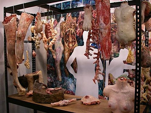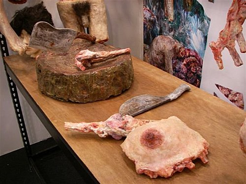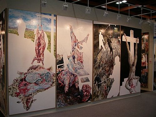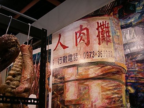 肉攤上擺放著血淋淋的肉品,不過仔細瞧瞧,發現竟然是人腿、人腦和人體器官,原來這是台灣藝術家洪天宇的創作「人肉攤」,希望藉由強烈的視覺畫作,喚起人們愛惜大自然的意識。洪天宇是一個很特別的人,從小被父母拋棄,收養他的是一個跛腳的單身男子,窮困,住在墳場邊的草屋,沒有朋友,由於不知自己來自何處,加上生活環境特殊,扭曲了他年幼的人格,也因此用不同於一般人的眼睛觀看世界。好在他喜歡藝術,擅長繪畫,這救贖了他,他的畫讓人想到畫屠宰場為主的史丁。