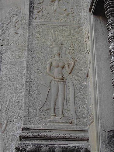 從裡邊向外望,赫然發現,牆上有許多婀娜多姿的人像浮雕,據說是象徵仙女下凡,以千年前的雕刻技術來說,竟然能把仙女刻畫的如此活靈活現,而且每一尊的表情、面貌、衣著完全不同,真可說是鬼斧神工之作。這一群手足舞蹈的美麗仙女叫做阿帕莎拉,又被喻為是東方的蒙娜麗莎,相傳是由浪花所變成的。宏偉的吳哥窟正因為有了這群俏麗的仙女環繞,而整個鮮活了起來。