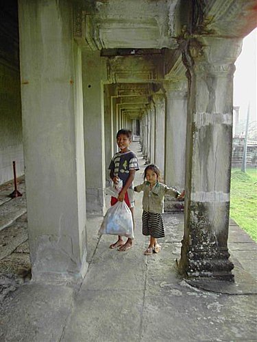 迴廊上撿拾寶特瓶的柬埔寨小兄妹