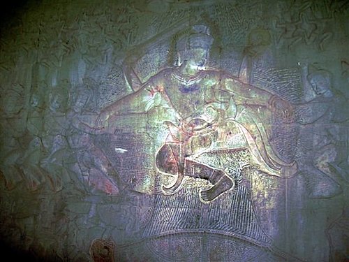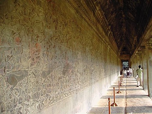 東面左翼的迴廊壁雕,名為“乳海翻騰” (Churning of the Ocean of Milk),是吳哥窟最引人入勝的神話故事之一。畫中描述一個非常有名的印度教神話故事:話說大乳海之下藏有長生不老藥,起初神仙與阿修羅各自爭奪,但大家都無法成功,後來保護神毘濕奴 (Vishnu) 促成神魔訂下合作盟約,進行攪海取藥的工作。