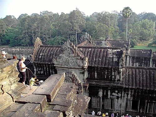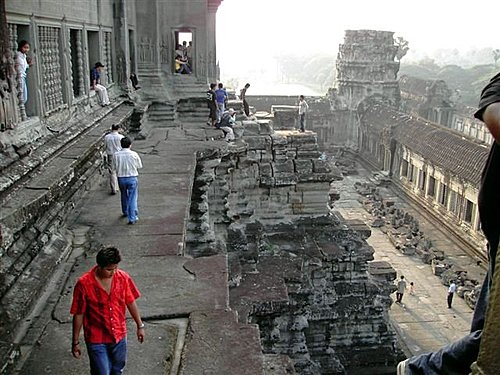 吳哥窟的五座塔尖,是聖山的象徵。在神廟第三層的主神殿,就是眾人所追尋的升天之道;還有人說這是天堂之梯。在陽光的輝映下,聖山顯得是如此的高不可攀,著實令人有些心生畏懼。神廟裡,三層迴廊的石梯,是一座比一座陡峭,有一種過關斬將的感覺。通往天堂的石梯有四層樓高,而且是一梯到頂,完全沒有緩衝的地方;石梯寬度大約是10公分,最陡的斜度甚至超過70度。