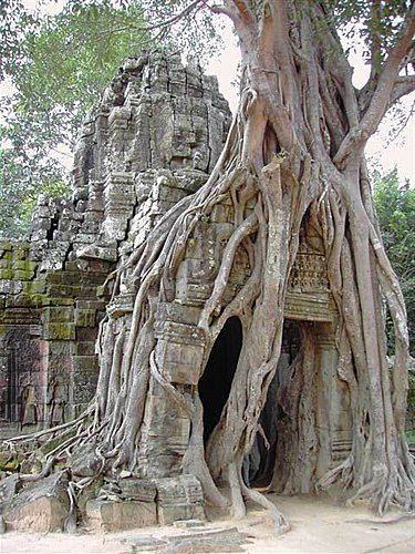 塔普倫寺(Ta Prohm)從十九世紀中葉法國人發現這群廟山之後,即因被樹根莖幹盤結地過份而放棄整修,保持了原始模樣。