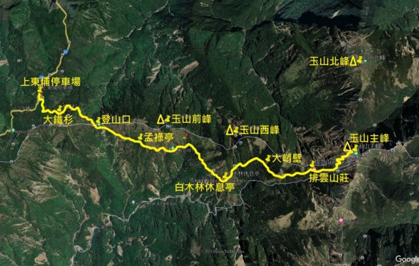 玉山主峰標高3,952公尺,有一等三角點,位於南投縣、嘉義縣、高雄縣之縣界。為「五嶽」、「百岳」之首,台灣及東亞地區第一高峰。全峰由赤褐色的頁岩所構成,半峰以上全是裸露的岩石,登頂之前有一處十分有名的「風口」,峰頂視野遼闊,全省的名峰都在它的展望之下,令人有「登玉山而小天下」之感,不愧為台灣的聖山。