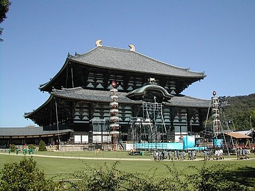 東大寺大佛殿,正面寬度57公尺,深50公尺,為世界最大的木造建築。大佛殿內,放置著高15公尺以上的大佛像——盧舍那佛。東大寺院內還有南大門、二月堂、三月堂、正倉院等。南大門有很著名的雙體金剛力士像。二月堂能夠俯視大佛殿和眺望奈良市區。