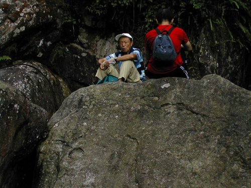 79歲的領隊老先生在溪谷石頭上野餐