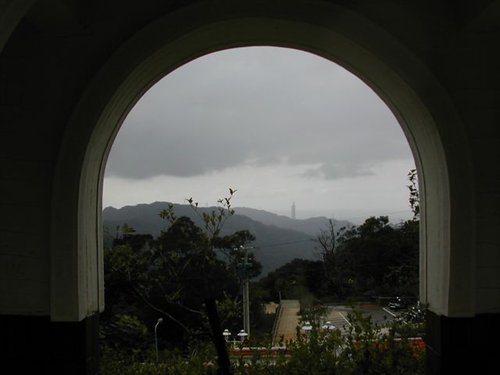 從南港茶葉製造示範場圓拱門看台北101