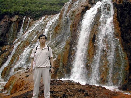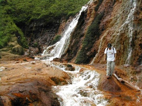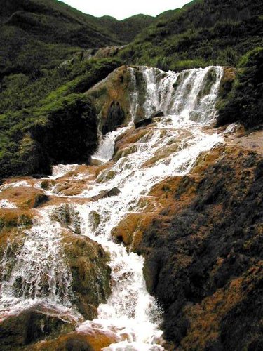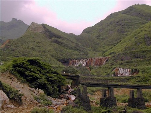 早期金銅礦務局開採時的棄土場,經小溪及坑道內地下水浸泡,並有菌類附著滋生,金銅礦沉積物成溪床,形成金黃色的瀑布奇觀。