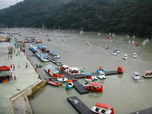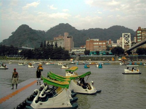 碧潭上滿佈遊潭的天鵝船