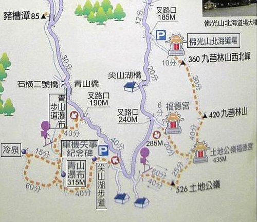 青山瀑布座落在石門鄉近三芝鄉界山區,原名為尖山湖瀑布,因溪谷斷層而造就的瀑布,正巧背倚高大的竹子山,因此水量特別充沛,逢雨季時瀑水成為傾斜型瀑布,氣勢非凡而壯觀,鄉公所重整並新建步道後,此地逐漸成為闔家大小共同踏青的好地方。沿著往青山瀑布的步道而上,可聽到潺潺流水聲,那是循著步道而建的灌溉渠道所發出的,水質清澈見底,為前往青山瀑布的遊客帶來濃郁的涼意。