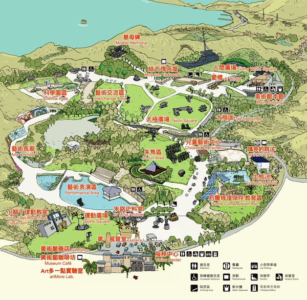 美術館佔地約11甲,目前開放8甲左右,大多為戶外展示空間。全館空間可分成服務中心、第一展覽室、運動廣場、藝術表演區、朱雋區、兒童藝術中心、太極廣場、美術館本館、人間廣場、慈母碑、藝術交流區、科學園區、藝術長廊等。園區依山而建,高度約在海拔165-185公尺間,園區內可遠眺金山海景。