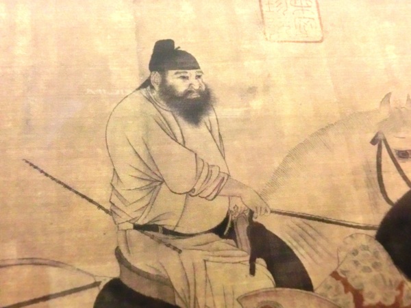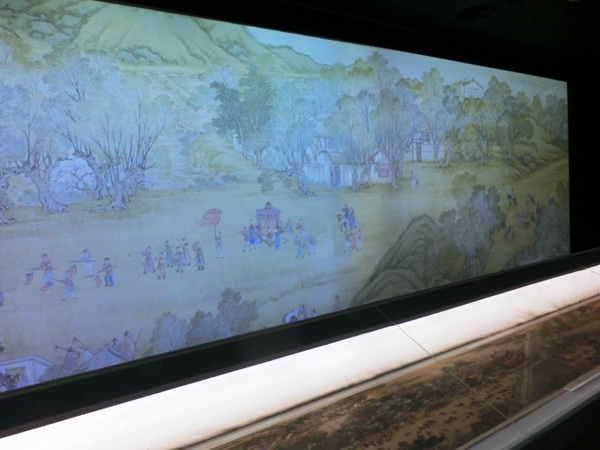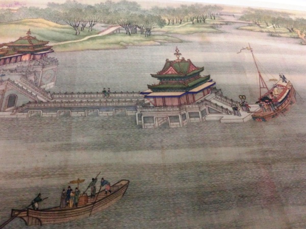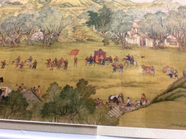 描繪的是皇帝在宮廷侍衛的護送下,騎馬出京,聲勢浩大的來到京郊的十三陵拜先祖,然後再坐船返回北京的情景。皇帝一出一入,相互呼應,氣勢壯觀,栩栩如生。