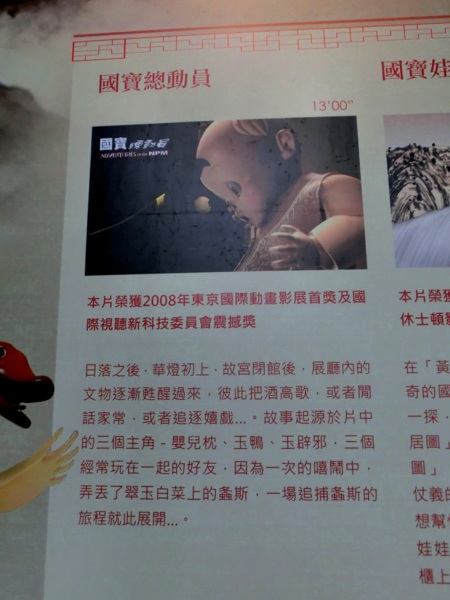 此外,大受好評且在海外屢屢獲獎的國寶總動員系列的三部動畫,也將於「國寶劇場」熱烈上映。性格迥異的故事主角:國寶娃娃嬰兒枕、玉鴨與玉辟邪,展開各自的冒險旅程,從多重觀點下重現故宮的歷史面貌與院藏珍品。