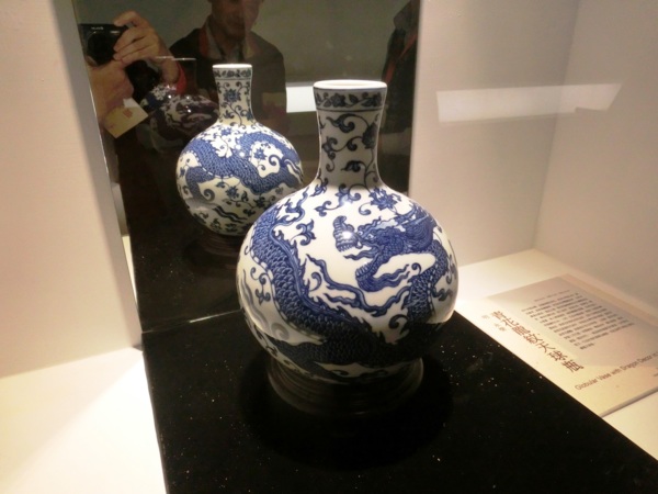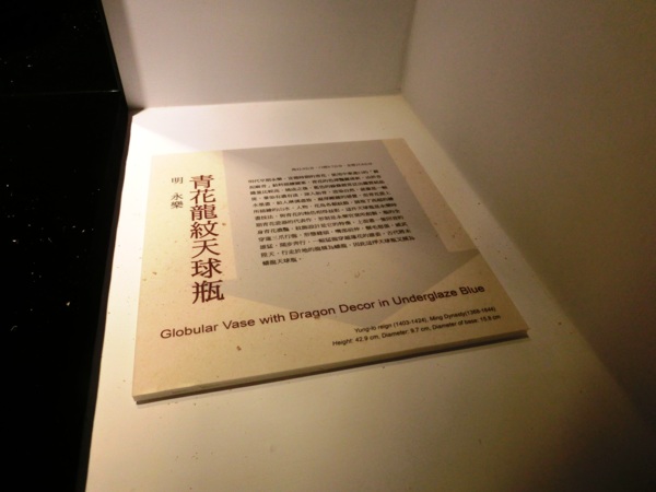 永樂、宣德年間,時有青花大型器如天球瓶、扁壺等作品的燒製。青花瓷器是以含氧化鈷的礦物為顏料,在瓷器坯體上描繪紋飾,施一層透明釉後,經約攝氏一千兩百度左右高溫燒造而成的作品。明代永樂、宣德時期的青花發色濃豔,並且帶有滲青鐵鏽斑點,形成獨特鮮明的風格,且成為清朝早期製作永樂宣德青花仿古瓷時的模仿重點。