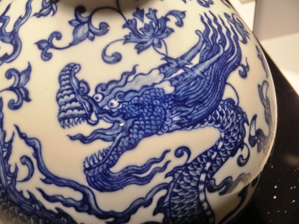 青花天球瓶碩大渾厚,器身環繞威武雄猛的穿蓮三爪行龍,整體氣勢堂皇莊重,是國立故宮博物院所藏永樂青花瓷器中的名品。天球瓶的胎體緻密,釉面瑩潤。口略外侈、直頸、圓鼓腹、平底微凹、無圈足。通體繪飾一回首張望的穿蓮三爪行龍,張口吐舌,露牙雙目圓睜,闊步張爪,龍身滿畫鱗甲,雄武矯健。瓶頸及背景空隙處則繪轉枝蓮花紋飾,青花艷麗濃重,繪畫線條流暢,展現此時製瓷的高超工藝。